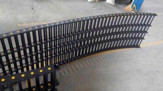 1 拖鏈外形似坦克鏈,由眾多的單元鏈接組成,鏈接之間轉(zhuǎn)動(dòng)自如。