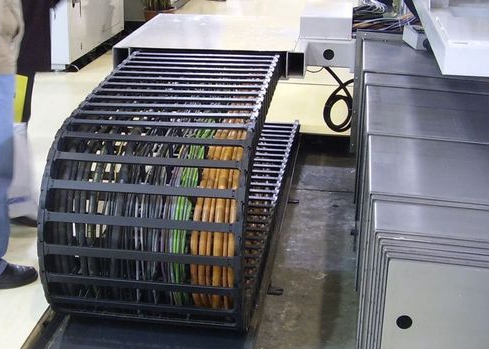 機(jī)電設(shè)備的活動(dòng)電纜跟隨坦克鏈一起運(yùn)動(dòng),以此來(lái)經(jīng)常來(lái)回彎折甚至還會(huì)受到坦克鏈的影響而被擠壓、牽拉,從而引起線(xiàn)路故障。為減少坦克鏈上活動(dòng)電纜的故障率,目前,通常的做法是,將電纜套裝在金屬防護(hù)軟管中,并固定在坦克鏈上,電纜隨著坦克鏈牽引運(yùn)動(dòng)而運(yùn)動(dòng)。隨著往返次數(shù)的增加,金屬防護(hù)軟管中的金屬保護(hù)層就難免會(huì)由于疲勞破壞而折斷,此時(shí)金屬軟管就不能起到應(yīng)有的防護(hù)作用,相反,金屬軟管中的金屬片由于已經(jīng)折斷裂開(kāi),反而會(huì)將電纜劃傷,甚至切斷電纜,造成電氣跳閘等線(xiàn)路事故。