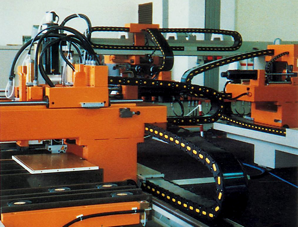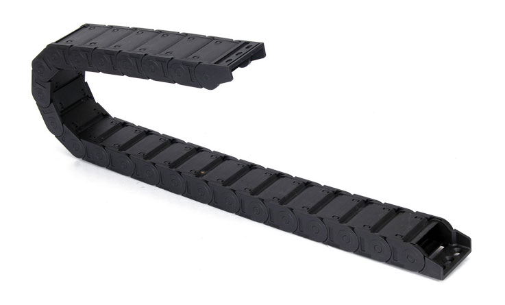 新型坦克鏈采用了一種柔性坦克鏈電纜保護(hù)裝置,利用柔性材質(zhì)具有韌度和伸縮性,并能夠反復(fù)彎曲成弧度而不變形的特點(diǎn)。將活動(dòng)電纜穿入該柔性軟管里,然后安裝在坦克鏈上,當(dāng)坦克鏈前進(jìn)時(shí),軟管里的電纜與鏈體運(yùn)動(dòng)方向一致,成“一”字形,當(dāng)坦克鏈后退時(shí),柔性軟管里成“U”字形。即便鏈條變形,軟管的彎曲的弧度及方向保持與鏈體運(yùn)動(dòng)方向一致,能夠解決拖動(dòng)電纜被坦克鏈軋斷或拉斷的問(wèn)題,并且電纜套在軟管里有一定伸縮空間,進(jìn)一步消除斷線(xiàn)因素,從而大大降低線(xiàn)路的事故率。